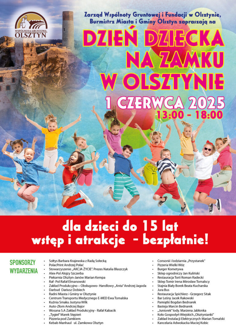Zaproszenie na niezapomniany Dzień Dziecka na Zamku w Olsztynie! Szanowni Państwo, drodzy Rodzice, Opiekunowie i przede wszystkim – kochane Dzieci! Z ogromną radością zapraszamy Was na wyjątkowe święto, które sprawi, że pierwszy dzień czerwca stanie się prawdziwą przygodą pełną radości, uśmiechu i niezapomnianych wspomnień! Zarząd Wspólnoty Gruntowej i Fundacji Gruntowej w Olsztynie oraz Burmistrz Miasta...Read More